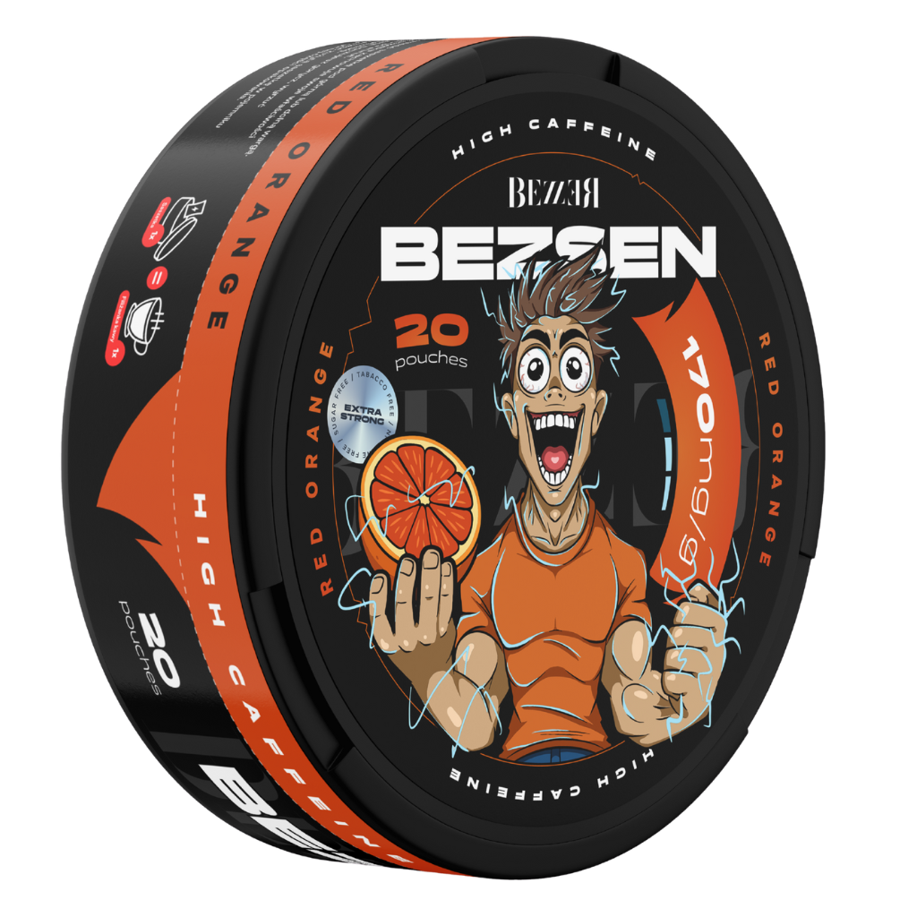 Snus kofeinowy BEZZER BEZSEN 170mg Red Orange to saszetki z kofeiną o cytrusowym smaku czerwonej pomarańczy. 170 mg kofeiny, mocne pobudzenie bez cukru!