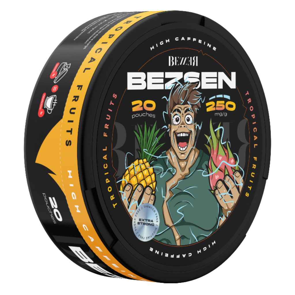 SNUS Kofeinowy BEZZER BEZSEN 250mg Tropical Fruits – 20 mocnych saszetek o egzotycznym smaku owoców tropikalnych. Ekstremalna energia bez cukru i kalorii!
