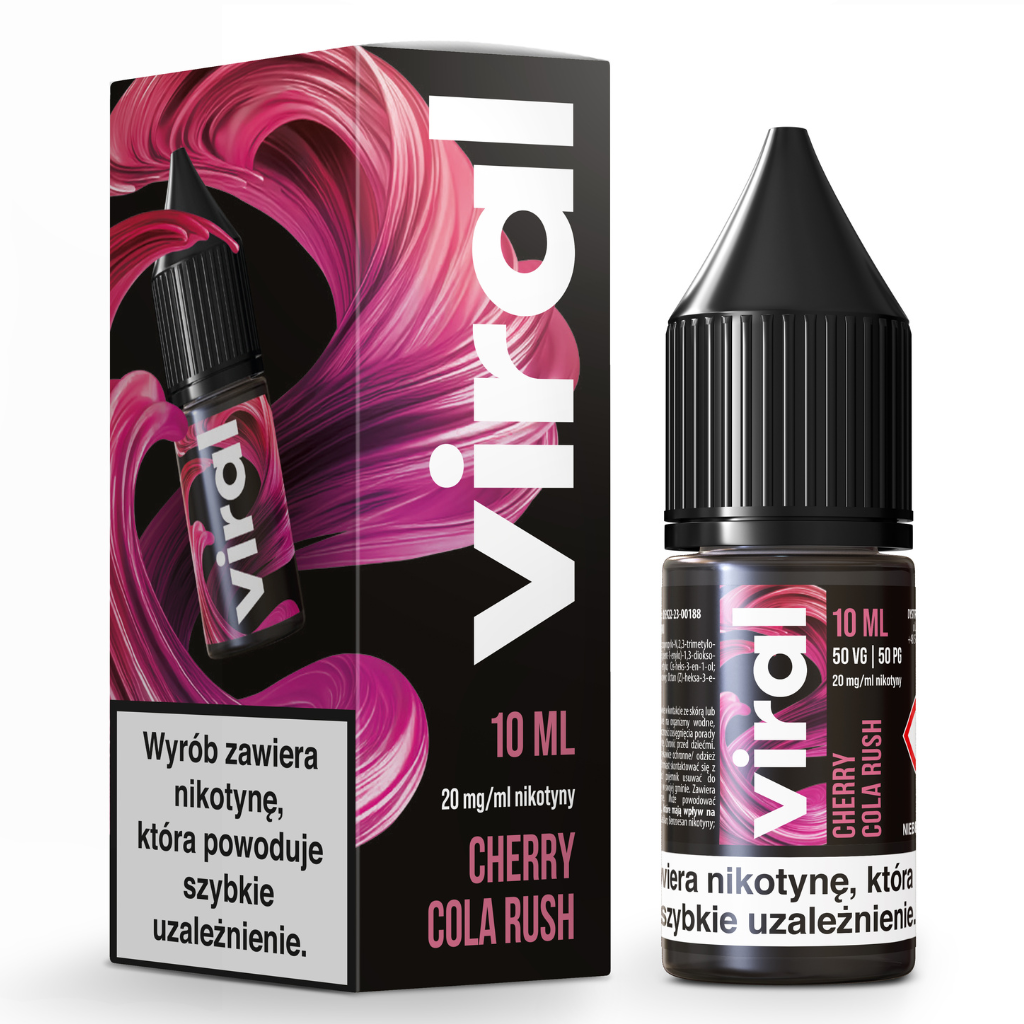 Liquid VIRAL Cherry Cola Rush to 10 ml gotowego płynu do e-papierosa z 20 mg soli nikotynowych. Smak klasycznej coli z dodatkiem wiśni.